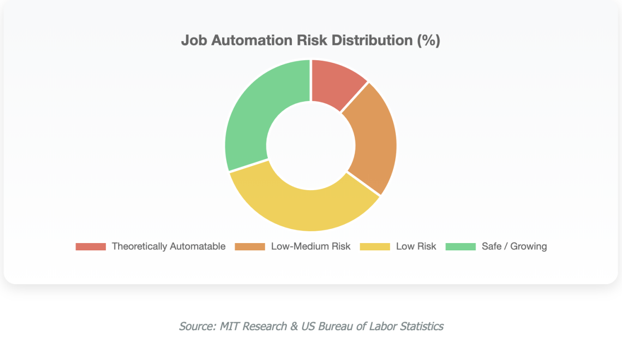 Contrary to dystopian predictions, historical evidence suggests that automation tends to reallocate work rather than eliminate it outright. Research from MIT indicates that approximately 11.7% of the labour market could be automated in theory, but whether automation will reach that level remains uncertain. Significantly, job losses as a share of total employment have trended downward over the past 30 years, even as automation and digital tools have become more widespread.