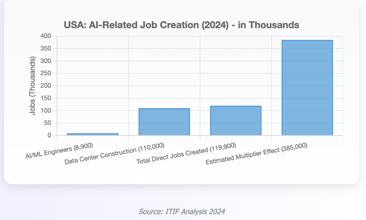 The United States stands at the forefront of AI development and deployment, with the technology’s impact on employment already becoming visible. In 2024, AI growth generated approximately 119,900 direct jobs in the U.S. economy. This includes more than 8,900 employees added specifically to develop, train, and operate AI models, including machine learning engineers and data scientists. Additionally, AI firms’ expansion of data centres fueled a surge in construction activity, with each large-scale data centre requiring roughly 1,500 on-site workers and taking up to three years to complete.