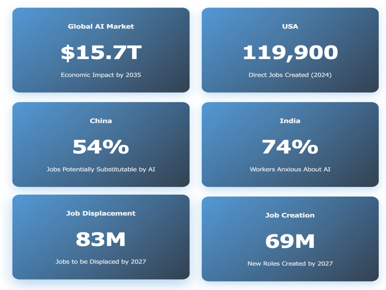 | Sources: – World Economic Forum, – PwC AI Jobs Barometer, – McKinsey Global Institute, – NASSCOM, – US Bureau of Labour Statistics, – Stanford HAI, – IIM-Ahmedabad, – Goldman Sachs Research, – Chinese Academy of Macroeconomic Research |