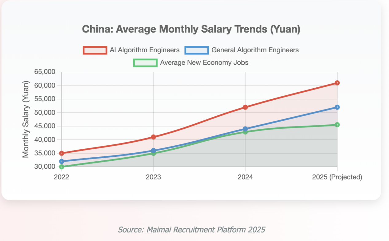 | Wage Premium for AI Skills: Average pay for algorithm engineers specialising in AI-generated content is nearly 18% higher than that of general algorithm engineers. AI product managers earn more than 20% above their traditional counterparts, demonstrating the substantial economic value of AI expertise. |