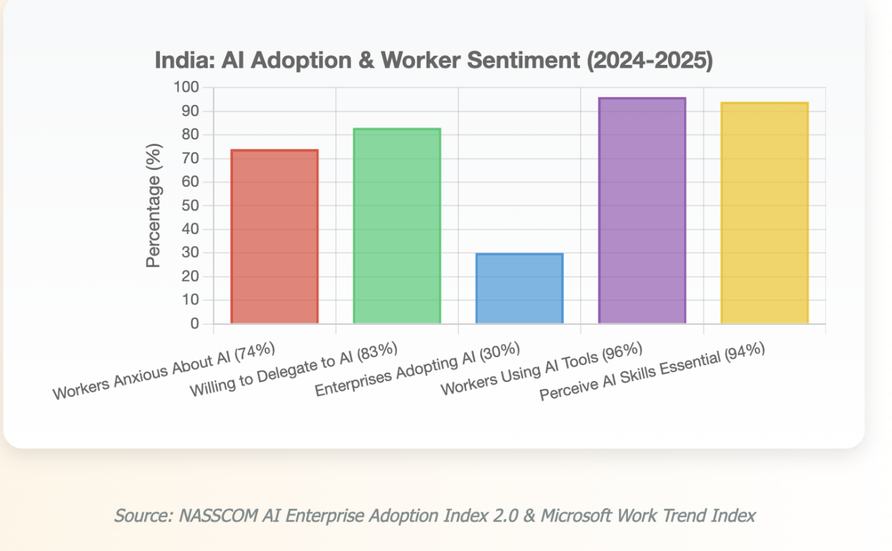 India’s relationship with AI is paradoxical. Despite widespread fear, 83% of Indian workers express willingness to delegate as much work as possible to AI to alleviate their workloads. This reflects a complex mix of anxiety and pragmatic acceptance. The country ranks among the top three nations in Stanford University’s Global AI Vibrancy Tool, with India’s AI talent base expected to more than double by 2027, growing at a CAGR of around 15%.
