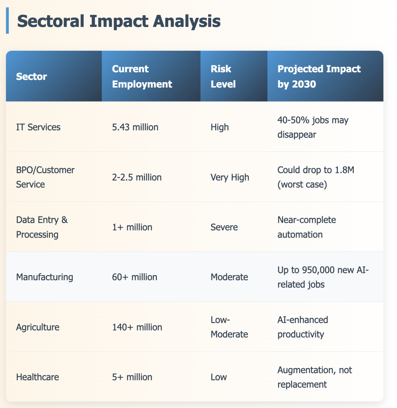 India presents perhaps the most complex and critical case study in the global AI employment transformation. With a workforce exceeding 500 million people, including 5.43 million IT professionals and millions more in outsourcing and business process management, India stands at a critical juncture. The nation is simultaneously one of the world’s largest AI adopters and one of the most vulnerable to AI-driven job displacement.