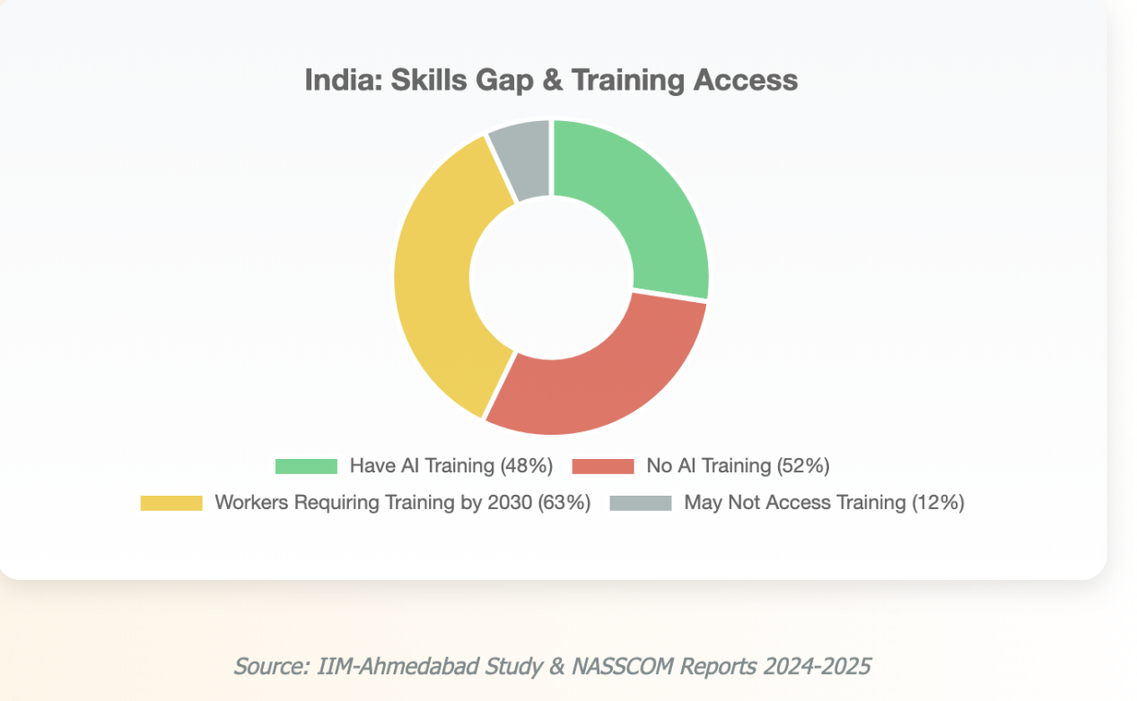 An IIM-Ahmedabad study of white-collar workers found that 68% fear their roles could be automated within five years, yet only 55% have adopted AI tools, and just 48% have received AI training. This gap between perception and preparation represents a critical vulnerability. The study also revealed that 40% of white-collar employees perceive their current skills will become redundant, highlighting the urgent need for reskilling initiatives.