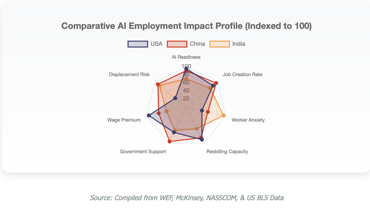 The three nations’ different stages of economic development profoundly influence how AI affects employment. The United States, as a mature post-industrial economy, experiences AI primarily as a productivity enhancer and job transformer, with relatively smooth transitions facilitated by robust social safety nets and educational systems. China, in the midst of transitioning from labour-intensive manufacturing to high-tech services, views AI as essential for maintaining competitiveness amid demographic decline. India, still developing its manufacturing base while maintaining a large services sector, faces the unique challenge of AI potentially “leapfrogging” traditional development pathways, creating both opportunities and risks for its massive young workforce.
