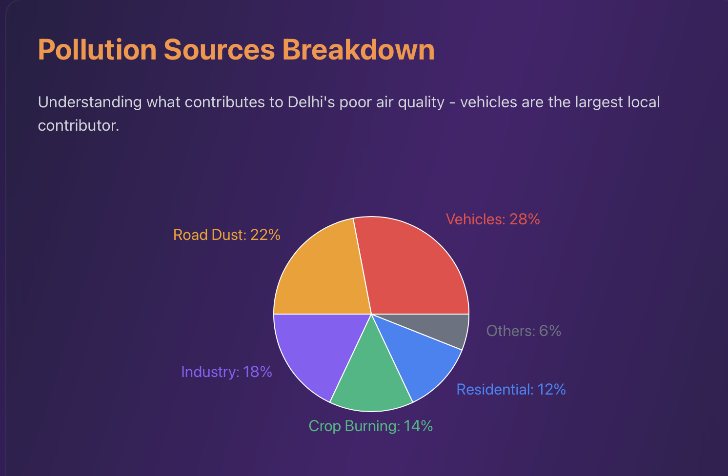 - Vehicles: The Major Offender: Vehicle emissions account for about 28% of fine particulate matter concentration, thus making the transportation sector the primary point of pollution in Delhi. Even with a network of more than 350 km of metro lines and 7,000 CNG buses, and despite the prohibition of older diesel and petrol vehicles, the surge in vehicle population has nullified these actions. The prevalence of two-wheelers, which pollute more per unit of fuel, exacerbates the situation.