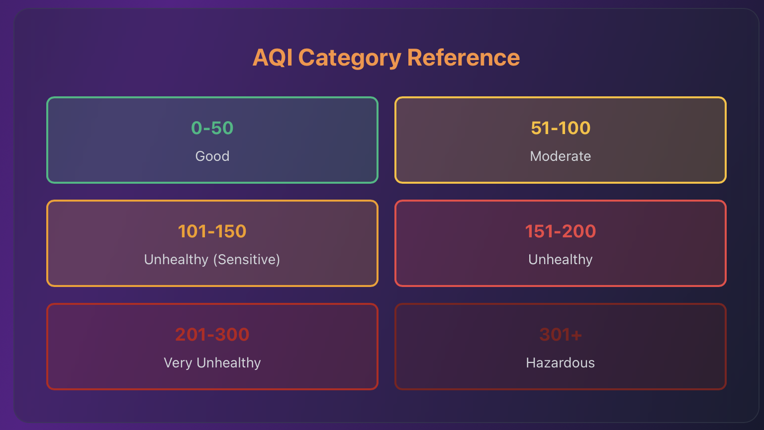| Data Sources: Central Pollution Control Board (CPCB), Commission for Air Quality Management (CAQM), AQI.in, IQAir World Air Quality Report, Government of India Press Information Bureau, Ministry of Earth Sciences, The Energy and Resources Institute (TERI), Centre for Science and Environment (CSE) |