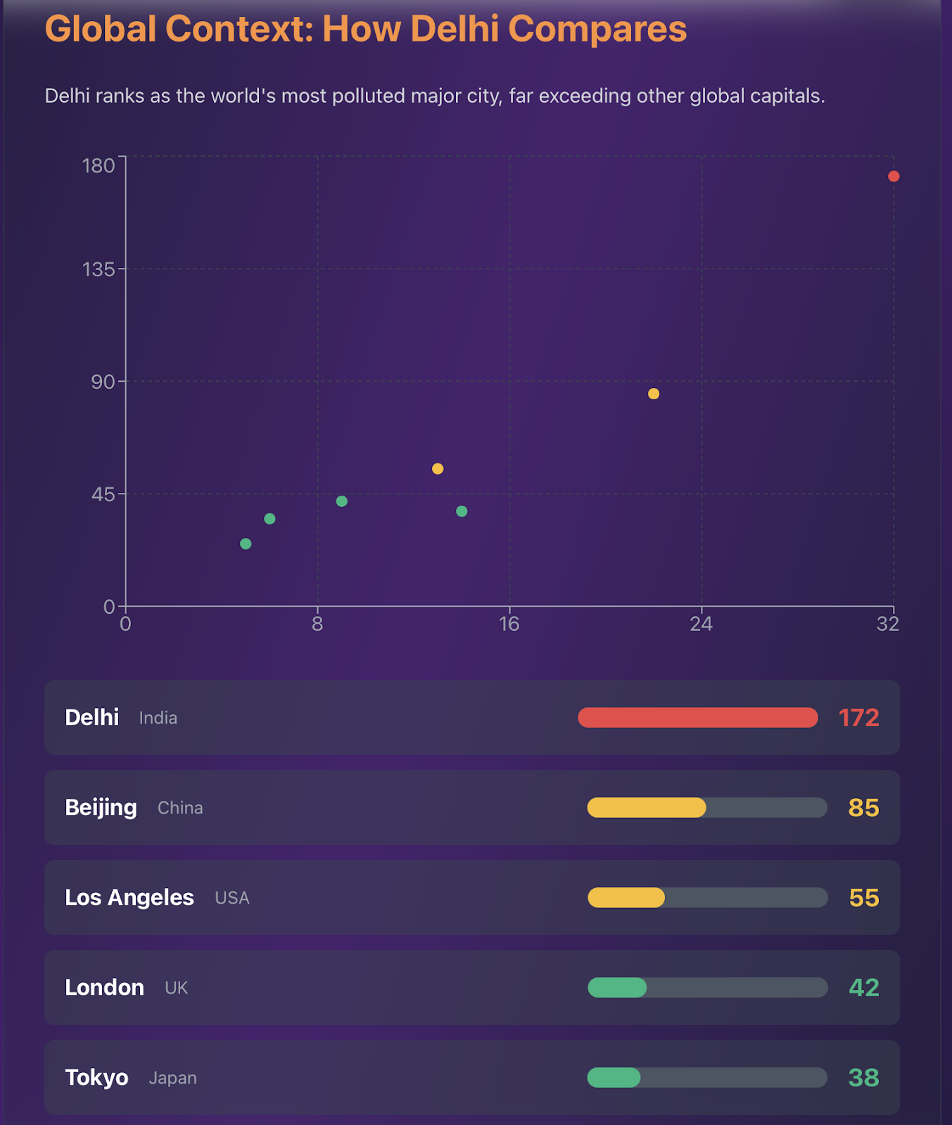 To grasp the pollution situation in Delhi properly, it is necessary to examine global comparisons first. New Delhi was the world’s most polluted major city in 2024. Additionally, India had 6 out of the 9 cities with the worst pollution worldwide. The city’s average AQI of 172 was a huge contrast to that of other top-polluted cities worldwide: