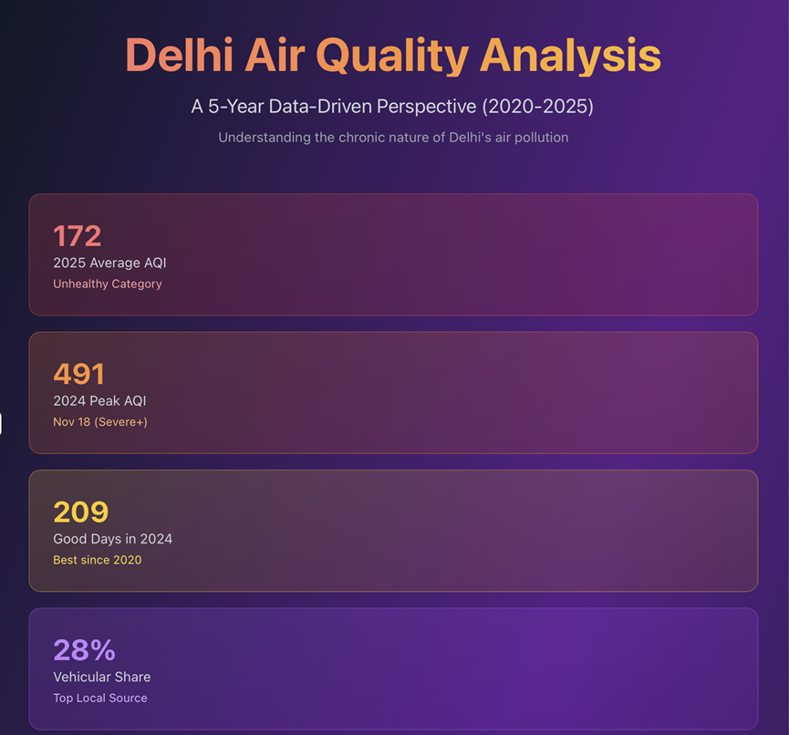 | This brief synthesises five years of air quality data (2020–2025) to demonstrate that Delhi’s pollution crisis is chronic, systemic, and year-round, not a seasonal anomaly. Delhi is used as a representative case of urban air failure in large, fast-growing cities, with global comparisons highlighting what sustained policy commitment can achieve. Five years of data show that Delhi’s air pollution is predictable, persistent, and policy-solvable. Incremental improvements prove progress is possible, but without long-term political commitment, Delhi will remain among the world’s most polluted cities—regardless of seasonal headlines. The evidence is settled. What remains unresolved is political will. |