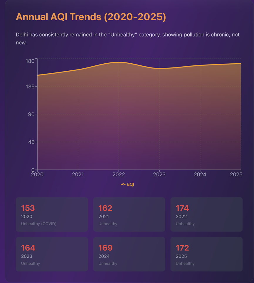 However, perhaps we should not limit our observations strictly to winter’s environmental concerns. A review of air quality data over the last five years (2020-2025) provides an interesting contrast to what has historically been viewed as “seasonal pollution issues.” The air quality index (AQI) yearly average score between 2020 to 2025 has consistently demonstrated that air quality in India was not to be interpreted as a temporary “pollution emergency,” but instead a long-term, systemic failure with a sustained, low-grade pollution problem.