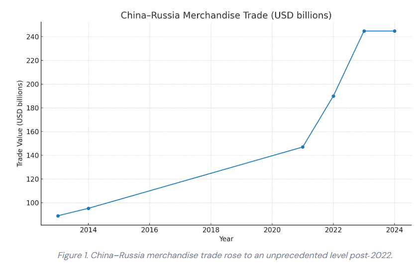 China has emerged as Russia’s unsinkable trade ally since 2022. Having oscillated for years between around $90–$110 billion, two-way commerce sped up: around $147 billion in 2021, around $190 billion in 2022 when Western companies pulled out of Russia, and a record-high near $245 billion in 2023–2024 in Chinese customs records.