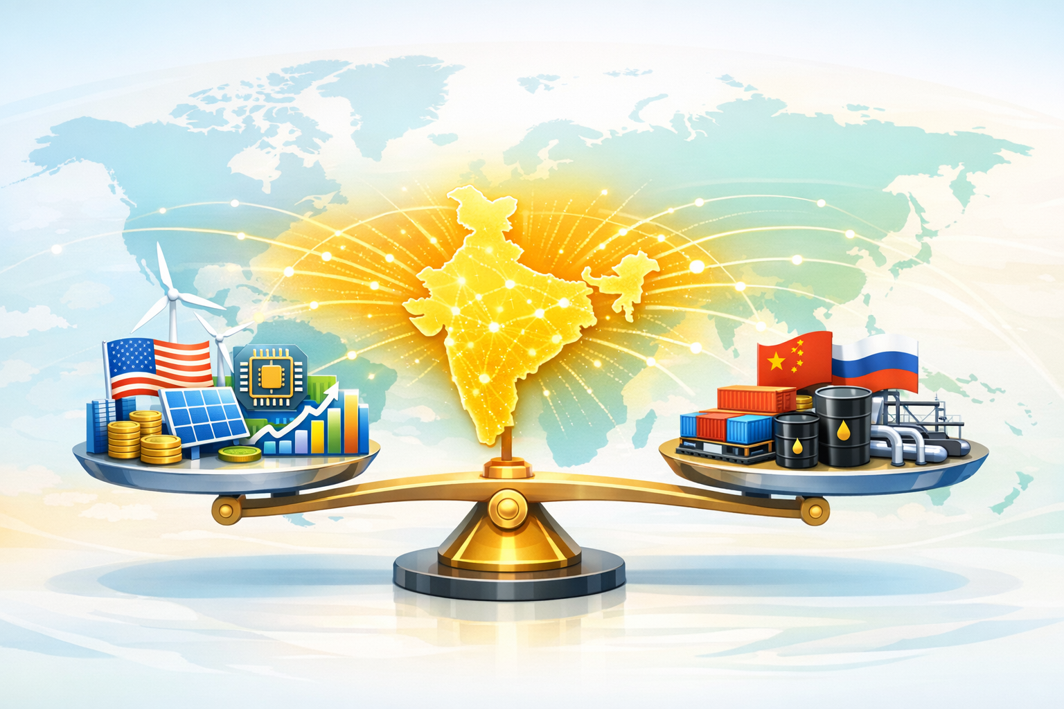 - Economic analysts see India as a ‘geo-economic swing state’, a country that can shape outcomes by engaging selectively with competing power blocs while preserving its strategic economy.
