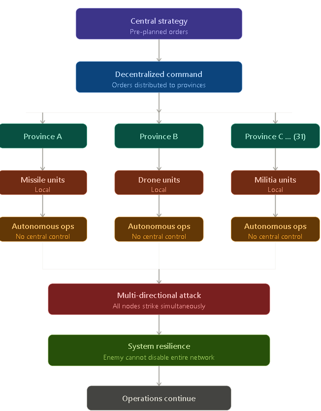 This structure is designed to ensure continuity of operations even in the event of a significant disruption to central command. By delegating authority downward, Iran reduces the risk that a single point of failure could halt military activity. As a result, traditional “decapitation strikes” targeting leadership are less likely to produce systemic paralysis. In centralised systems, leadership removal can significantly degrade operational coherence; in contrast, a decentralised structure is more resilient to such disruptions.