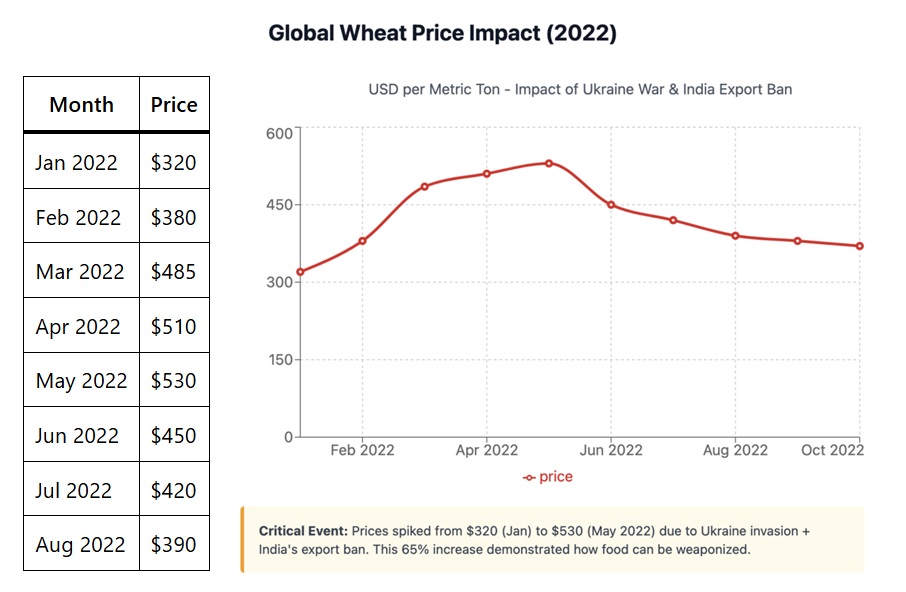 May 2022 was the inflexion point in grain geopolitics. As record-high heatwaves baked India’s wheat-growing areas, the government abruptly halted wheat exports to safeguard national food security. Wheat prices had already been elevated internationally because of Ukraine disruptions, but escalated immediately from around 450 USD per metric ton to 530 USD in just weeks. The signal was unmistakable: India, like Russia, could leverage food exports as geopolitical currency—and chose internal stability over international commitments.