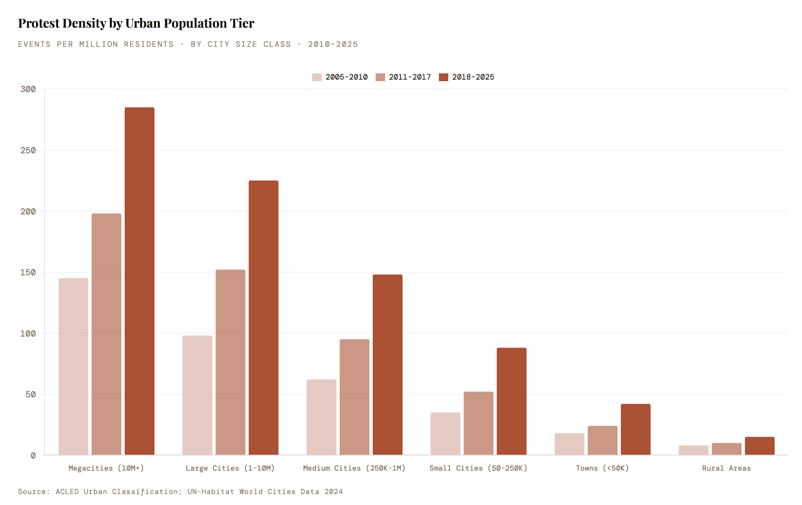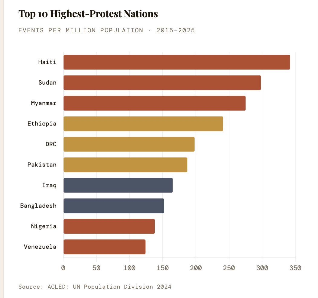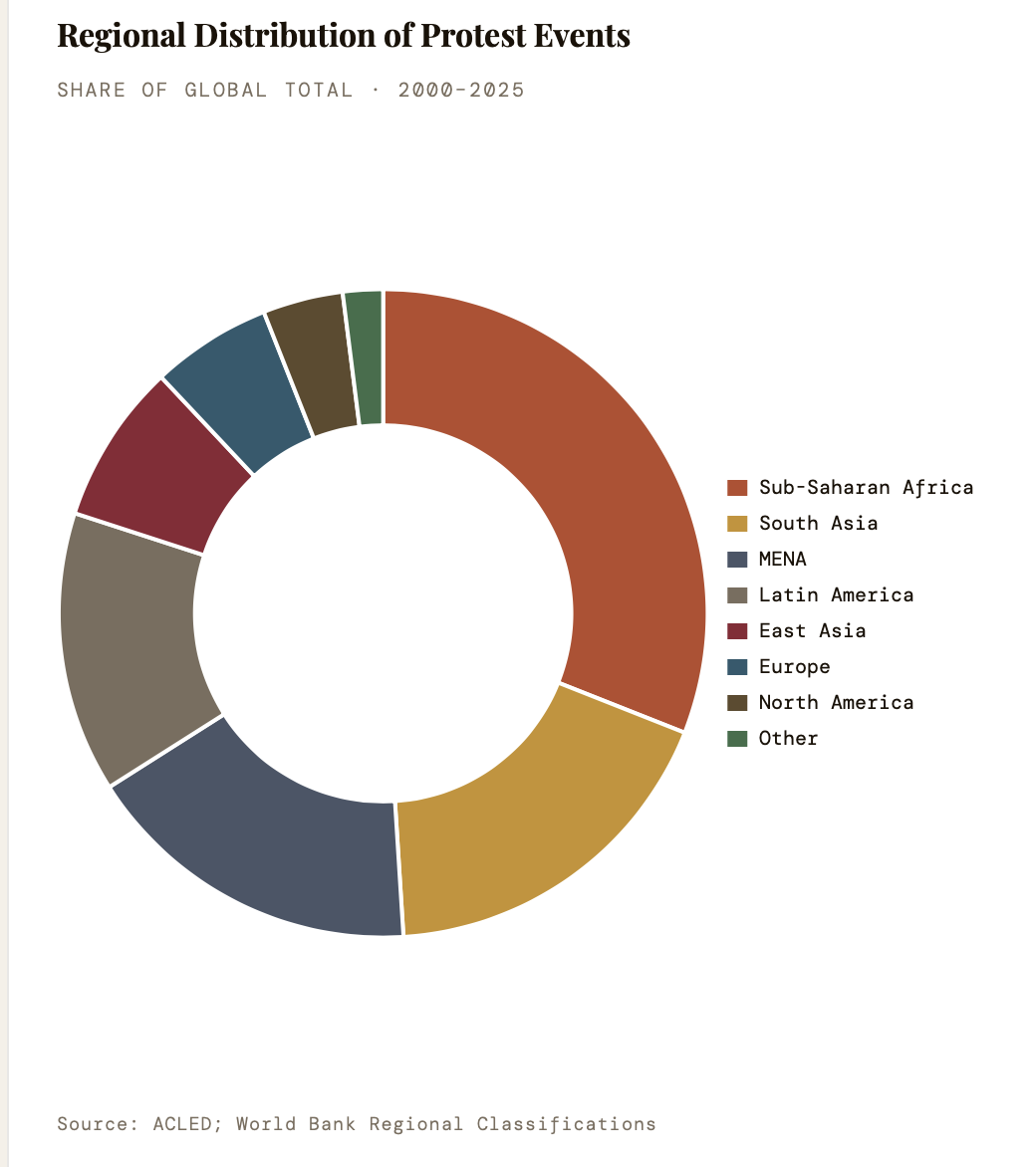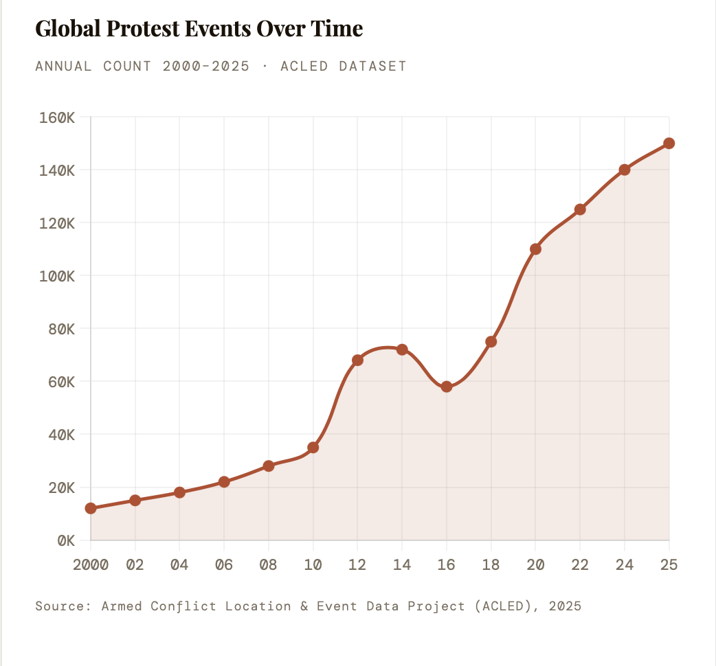 Climate stress now emerges as an accelerant in the post-2020 data, with ACLED recording a 210% increase in events coded as climate-related between 2018 and 2024 — concentrated in the Sahel, South Asia, and Pacific Island states. As demographic youth bulges interact with climate displacement and digital organising, the geography of protest will continue its expansion from capital squares to secondary cities, from national governments to global financial institutions.