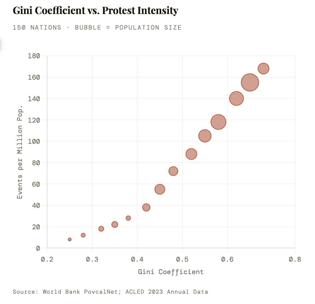 “A 10-point rise in a nation’s Gini coefficient correlates with a 62% increase in protest frequency within 36 months — stronger than any single governance variable.” — DERIVED FROM WORLD BANK + ACLED CROSS-REGRESSION, 20