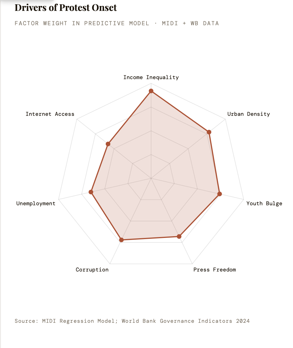 • ACLED event counts, World Bank Gini scores, governance ratings, and MIDI mobilisation indices reveal a combination of factors that produce the high-intensity protest environments.