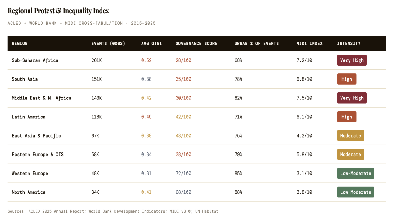 The table below synthesises ACLED event counts, World Bank Gini scores, governance ratings, and MIDI mobilisation indices into a comparative regional snapshot, revealing which combinations of factors produce the highest-intensity protest environments.