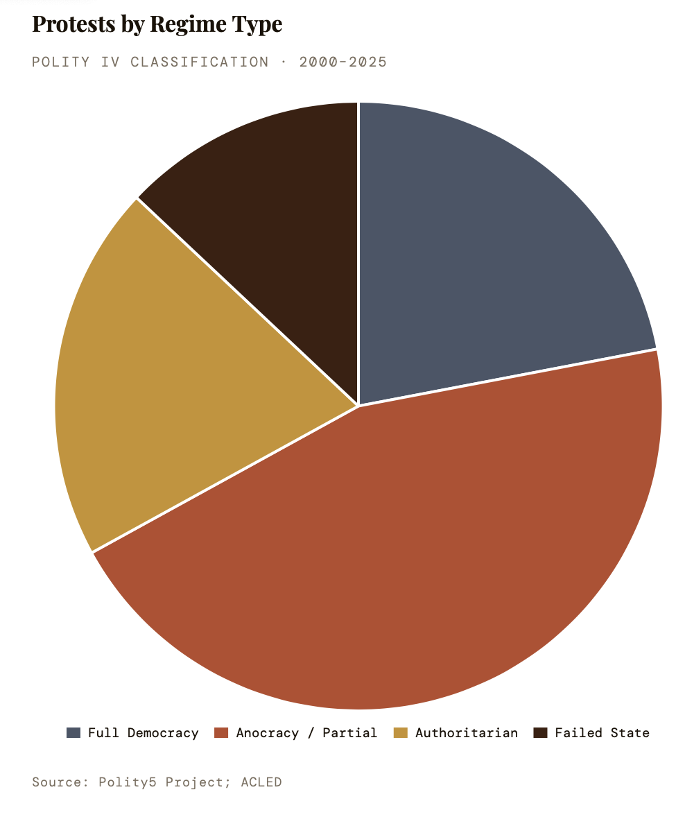 Counter-intuitively, full autocracies register lower protest rates than partial democracies (anocracies) — not because citizens are more content, but because repression costs are prohibitive. The “protest sweet spot” sits at Polity IV scores of 2–6: states permissive enough to allow assembly yet unresponsive enough to generate grievances. This describes 2024’s most volatile states: Bangladesh (score 5), Venezuela (3), Ethiopia (4), and Pakistan (6).